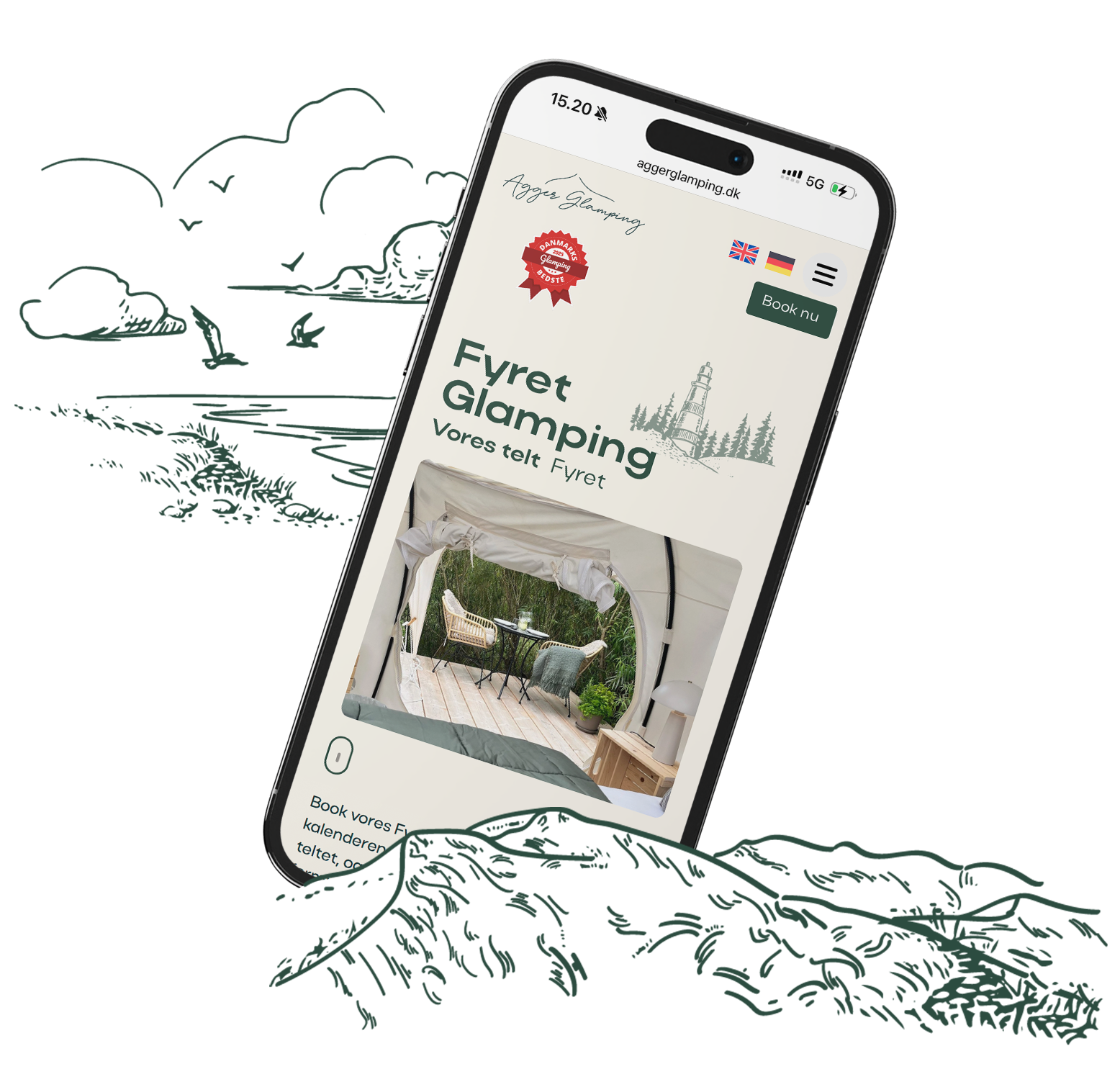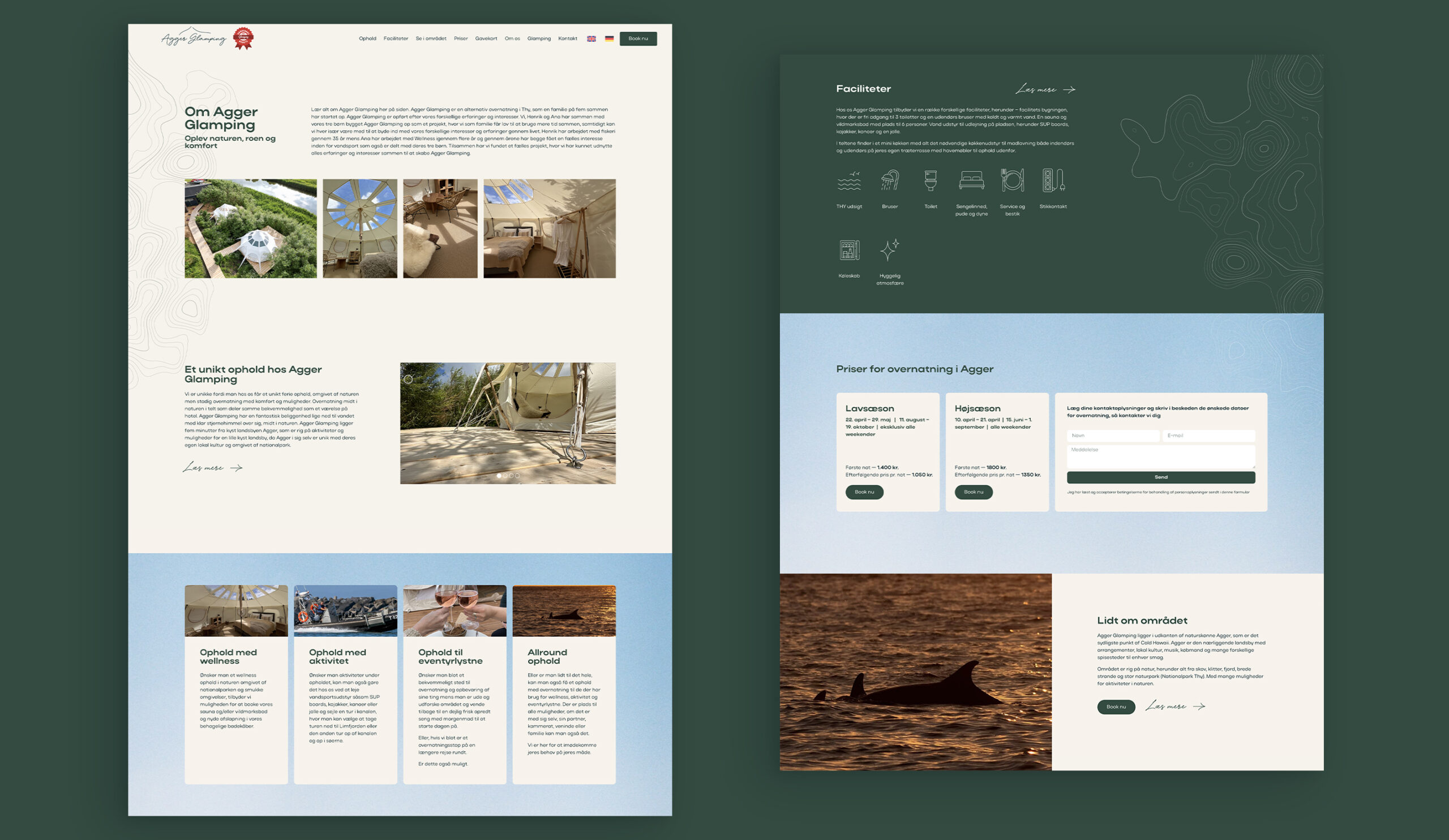 Agger Glamping kom til os med ønsket om en samlet digital løsning, hvor både visuel identitet, hjemmeside og booking skulle spille tæt sammen. Det var vigtigt, at det samlede udtryk formidlede den særlige oplevelse, Agger Glamping tilbyder – en kombination af natur, komfort og luksus – allerede fra første møde med brandet online.