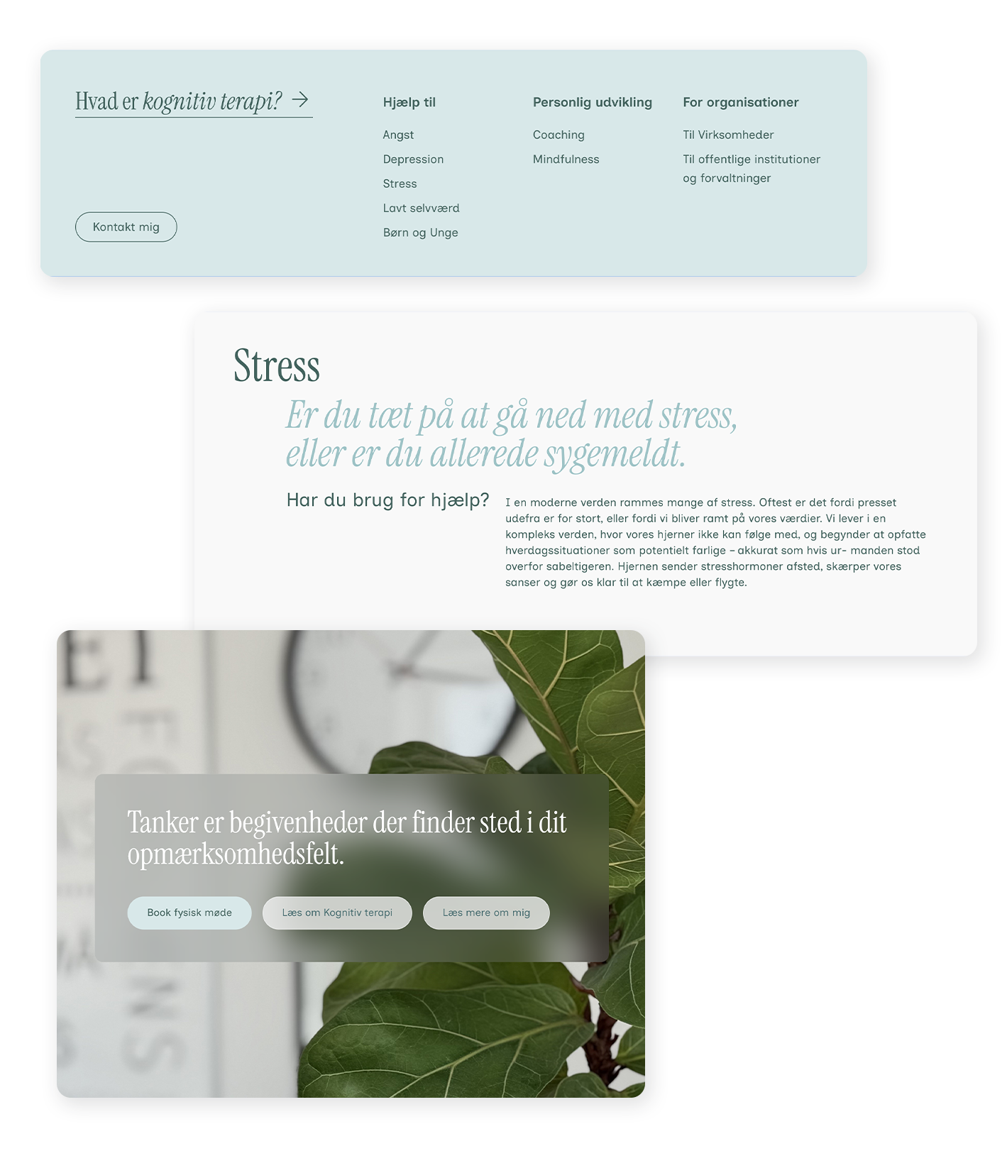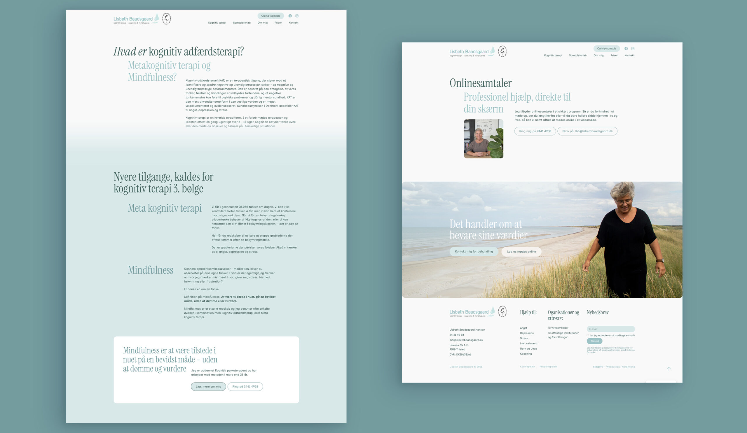 Et centralt ønske for Lisbeth var at gøre det nemt for besøgende at komme i kontakt eller booke en samtale. Derfor er kontaktinformationer, formularer og call-to-action-knapper strategisk placeret gennem hjemmesiden, så brugeren hurtigt kan tage næste skridt, uanset hvor de befinder sig i forløbet.